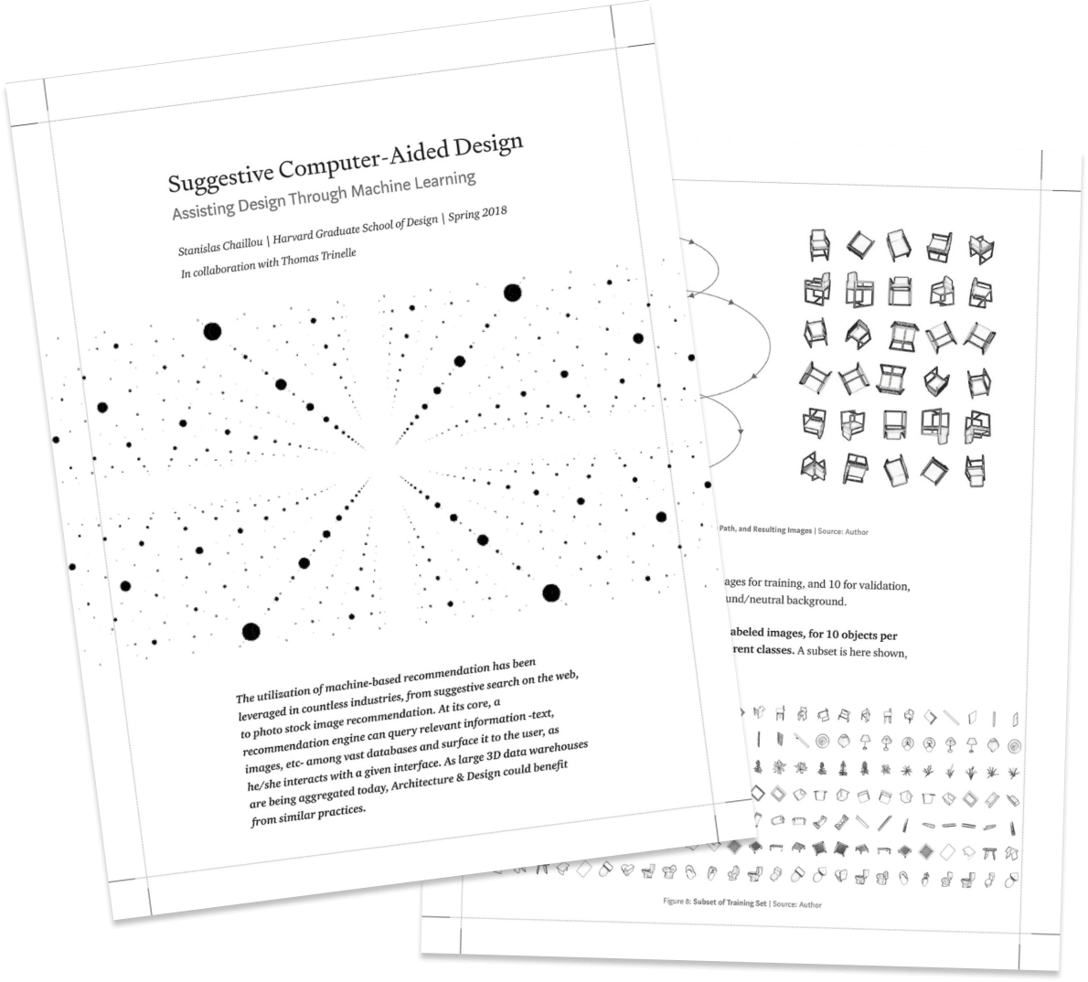 This is the goal of this article: study and propose a way to assist designers, through “suggestive modeling”. As architects draw in 3D space, an array of machine-learning-based classifiers would be able to search for relevant suggestions and propose alternative, similar or complementary design options.